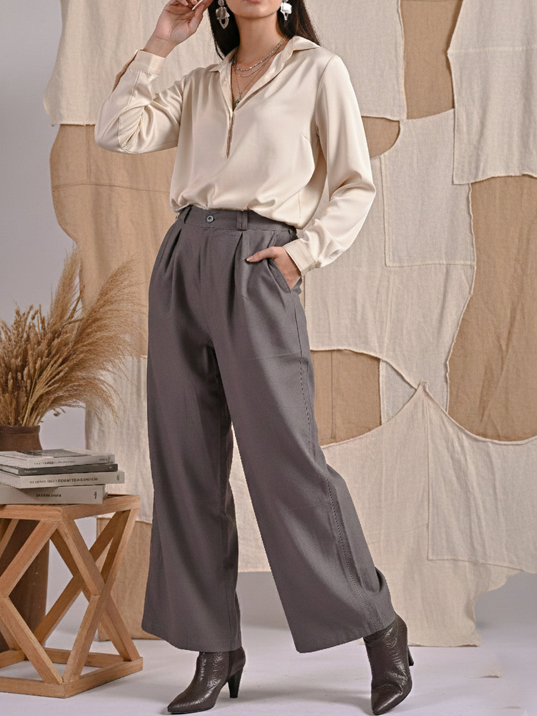 Grey Relaxed Fit Wide Leg Pants - Pure Cotton