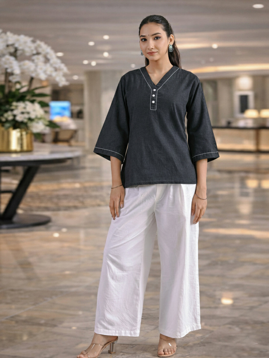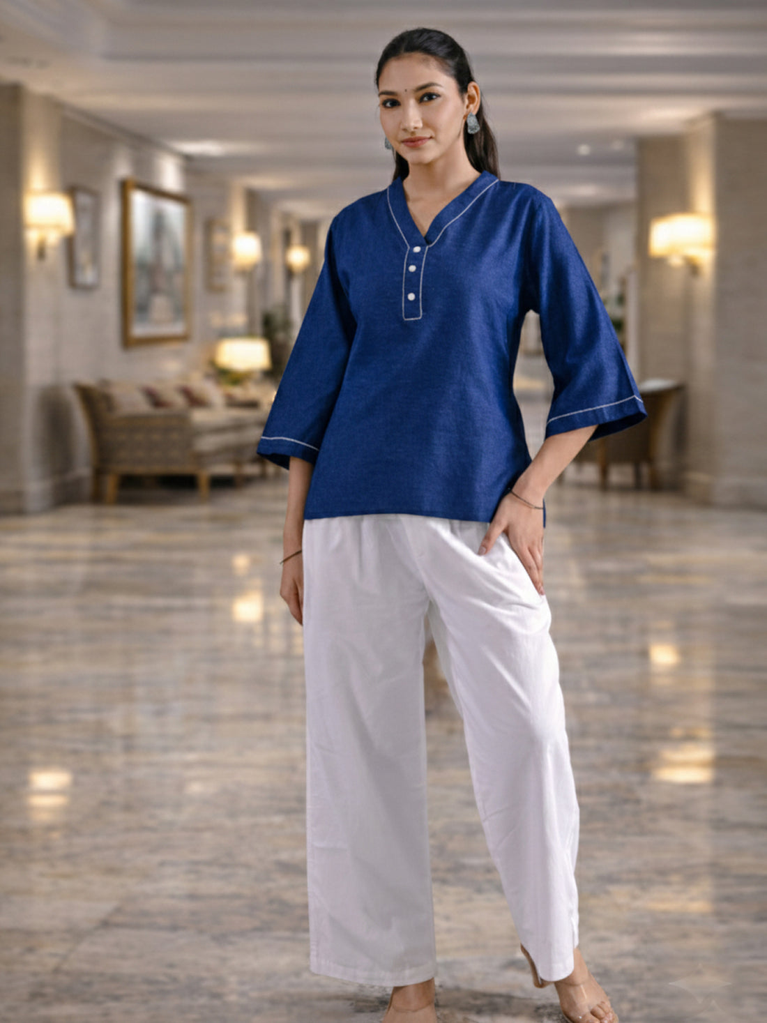 Denim Blue Handloom Cotton Anchor Thread Designer Top