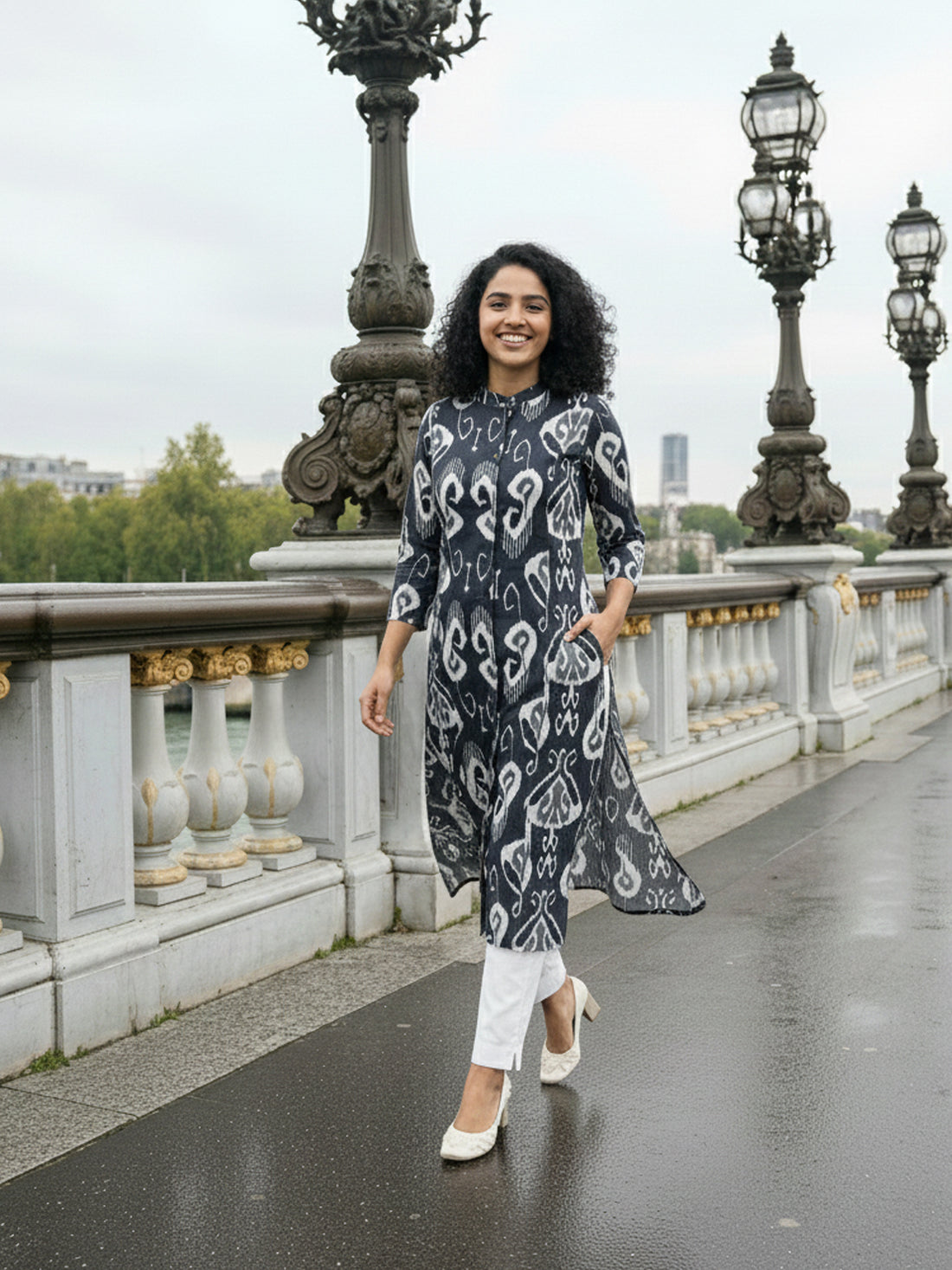 Enhance your ethnic wardrobe with this stylish Women’s Airy Linen Cotton Ikat Printed Kurta Set....