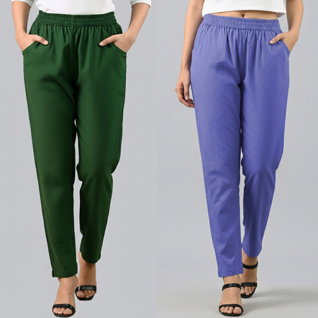 Bundle of 2 Bottle Green & Denimblue Everyday Cotton Round Elastic Trousers