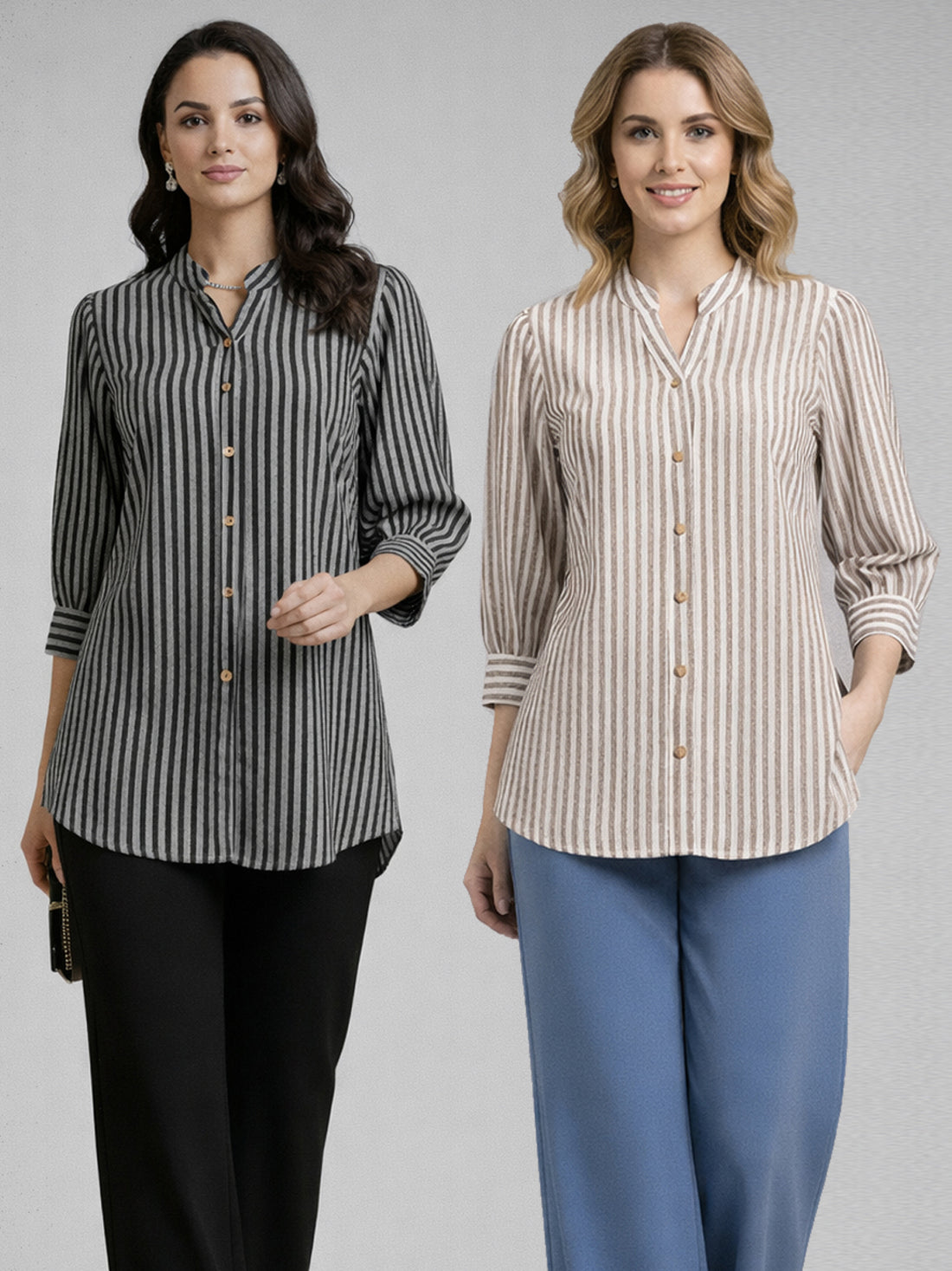 Bundle Of 2 Elegant Black & Brown Small Stripe Shoulder-Pleat Shirt