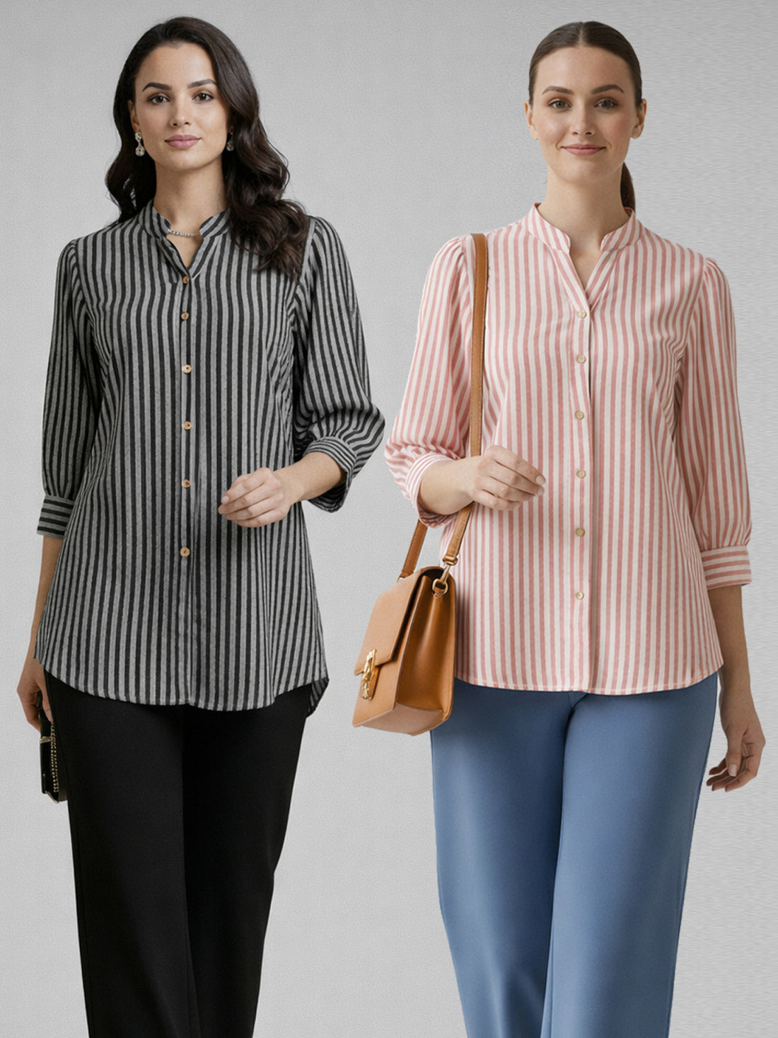 Bundle Of 2 Elegant Black & Pink Small Stripe Shoulder-Pleat Shirt