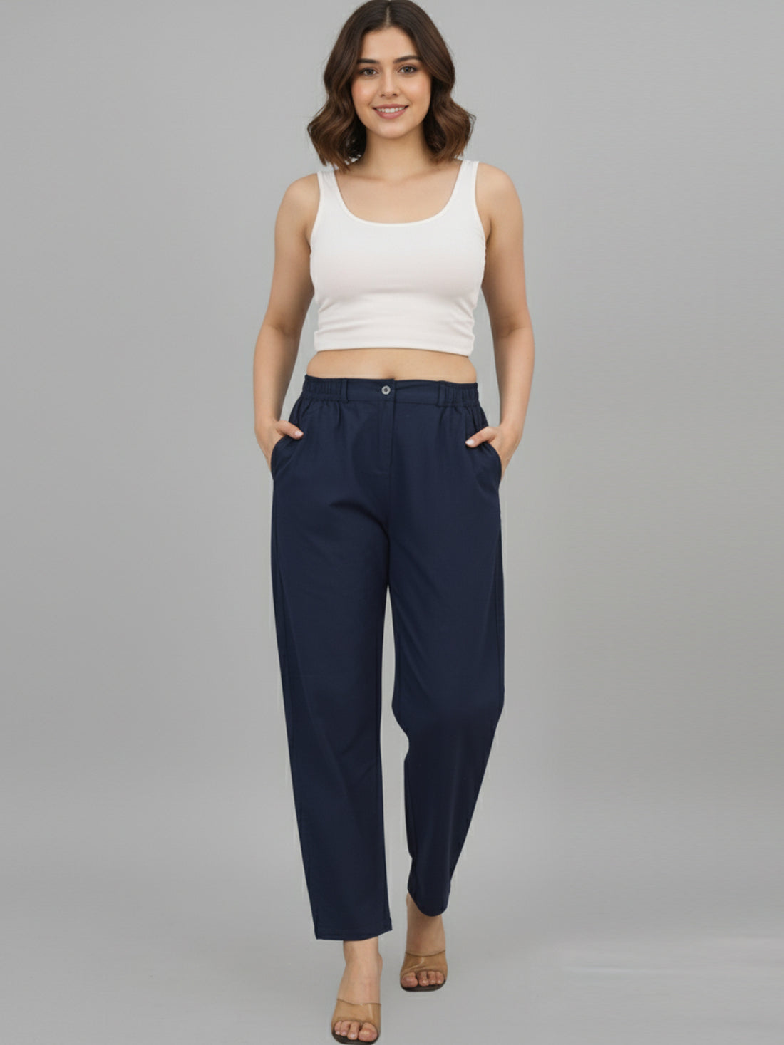 Everyday Navy Blue Cotton Pants With Zip Closure