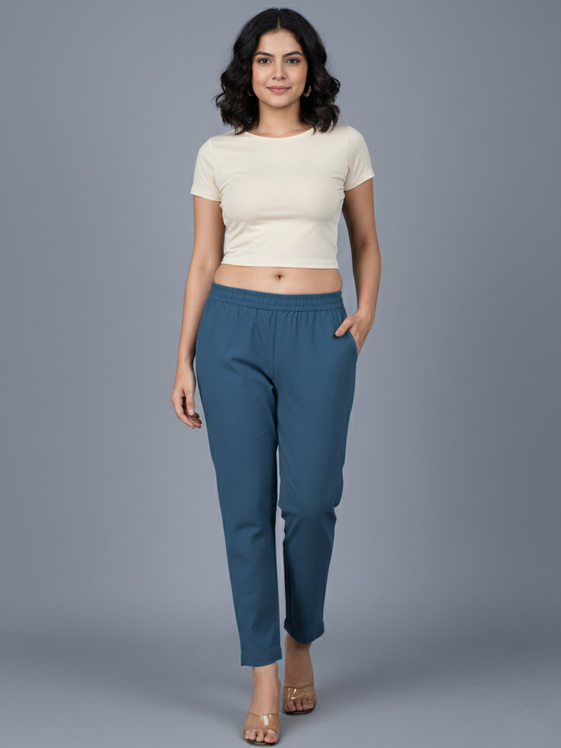 Everyday Teal Blue Cotton Fully Elastic Trouser