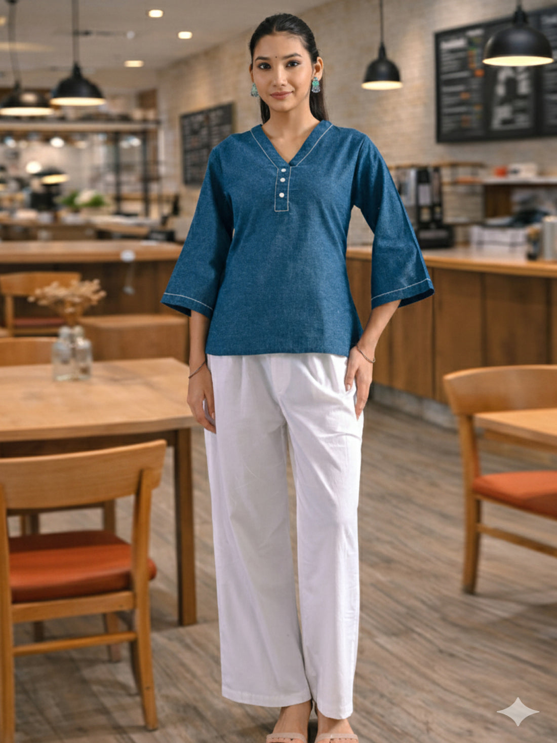 Denim Blue Handloom Cotton Anchor Thread Designer Top