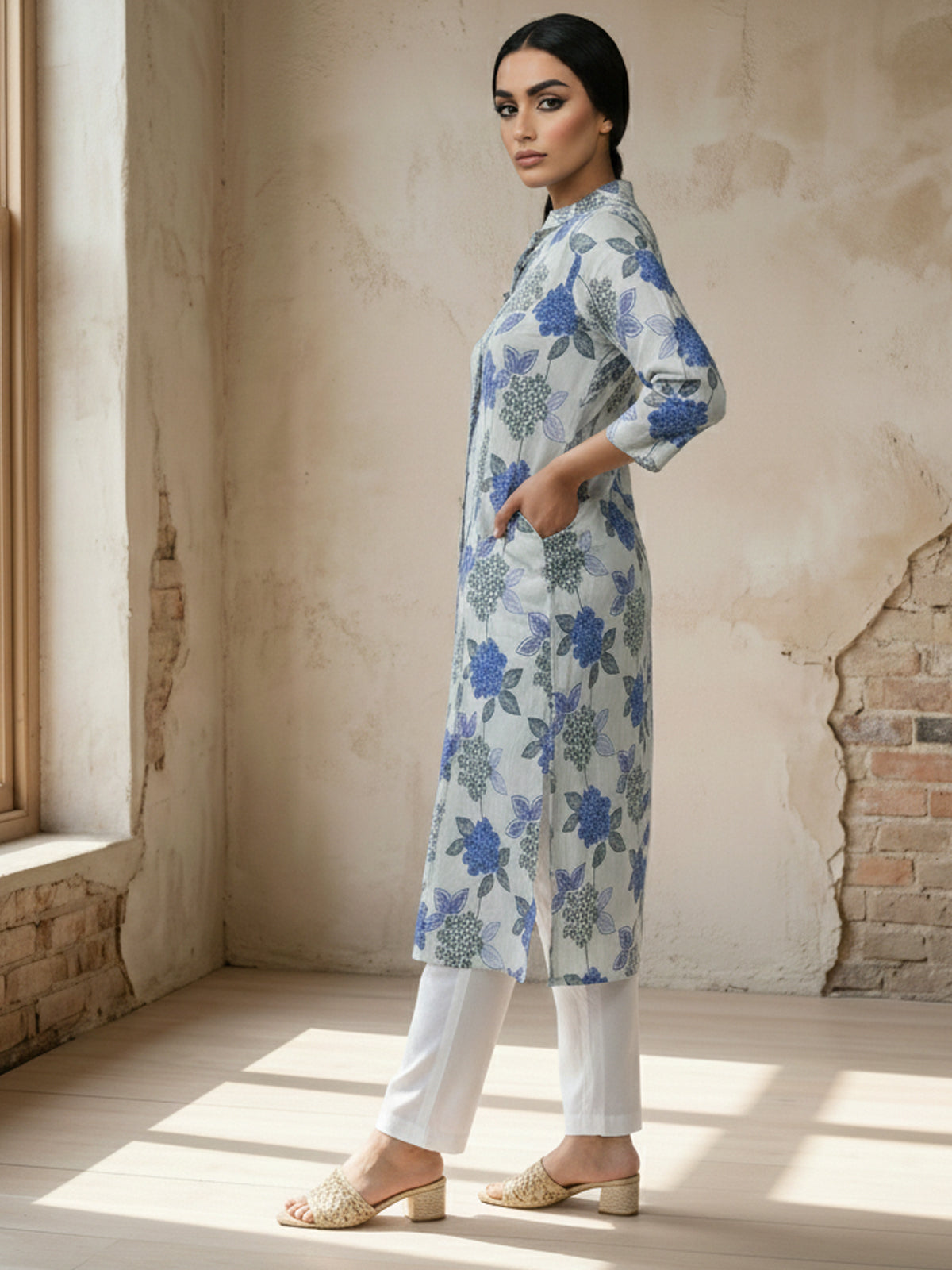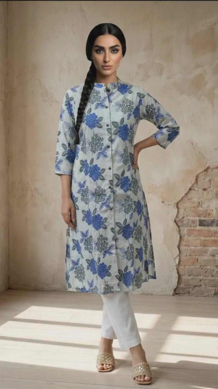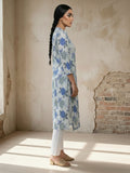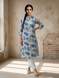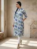 Blue Airy Linen Cotton Straight Printed Kurta Set
