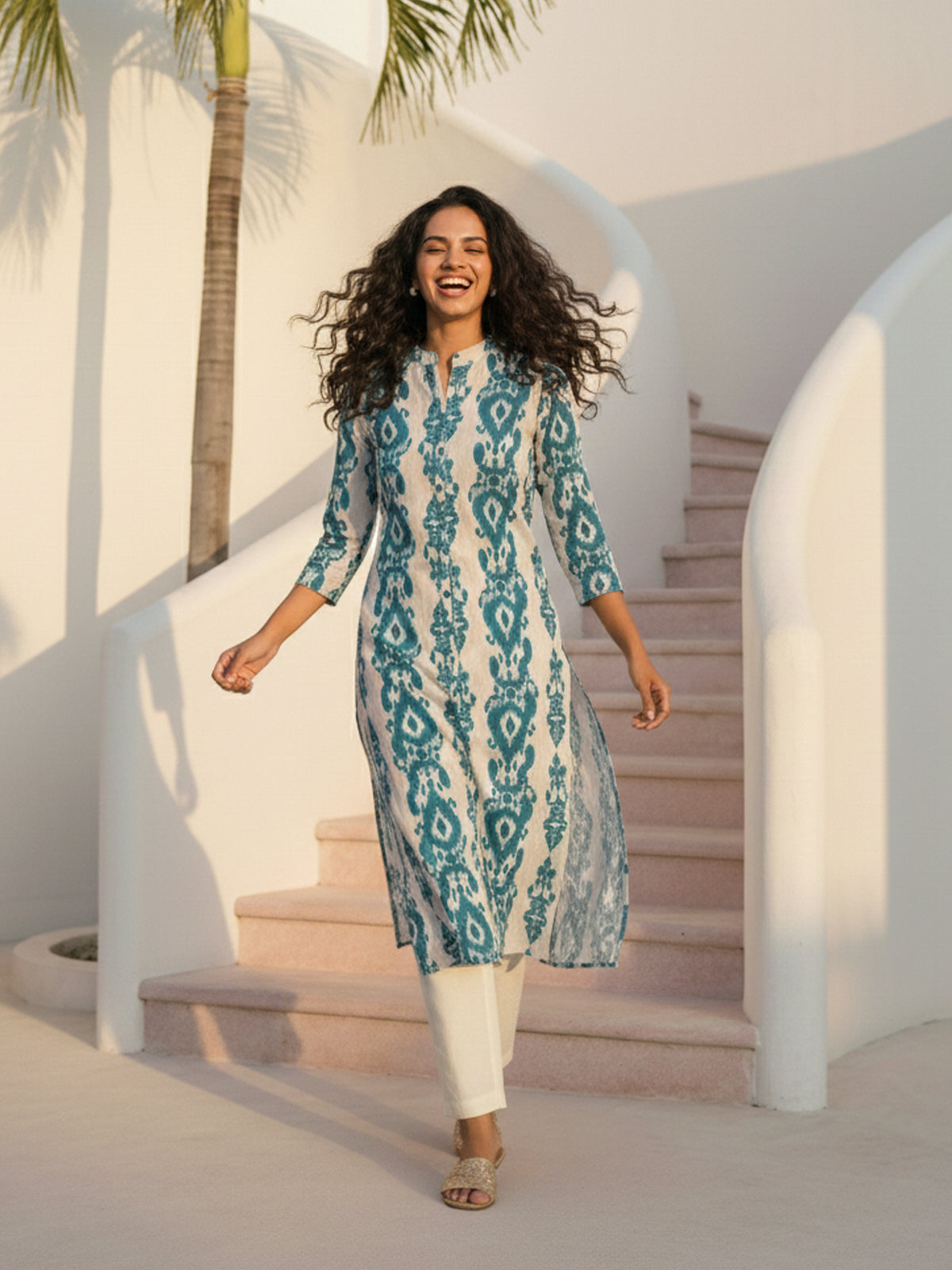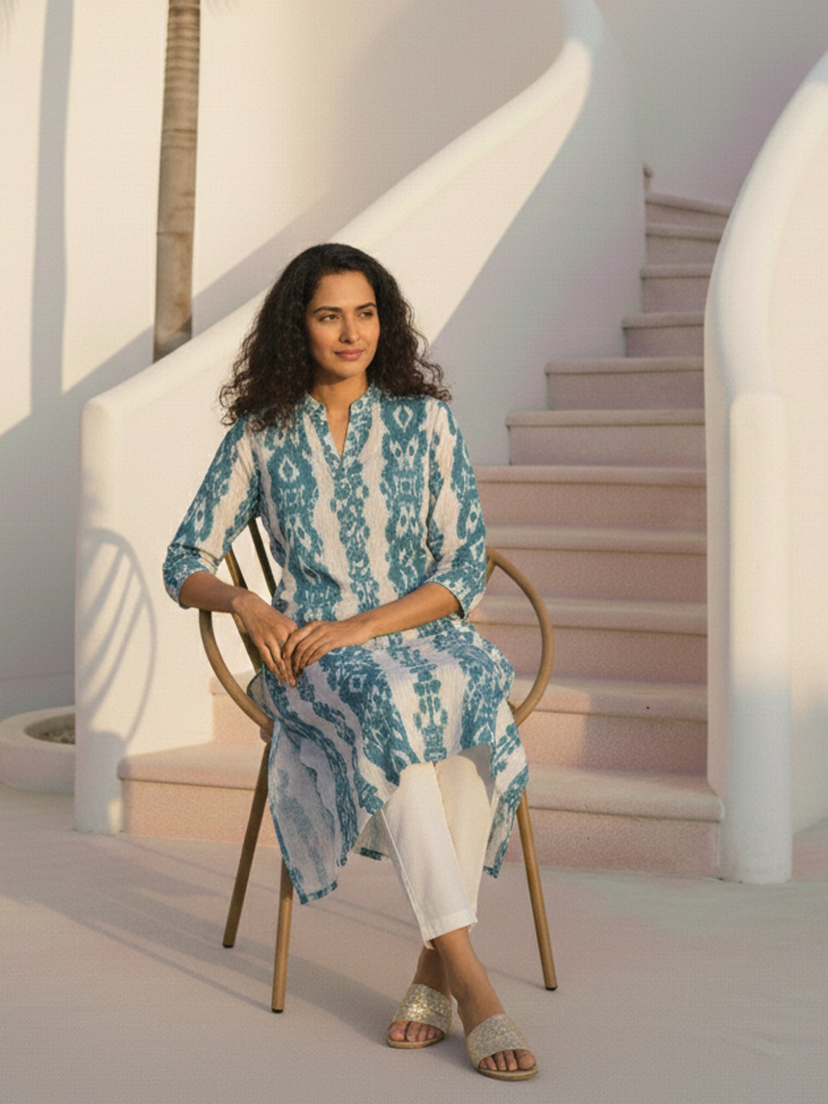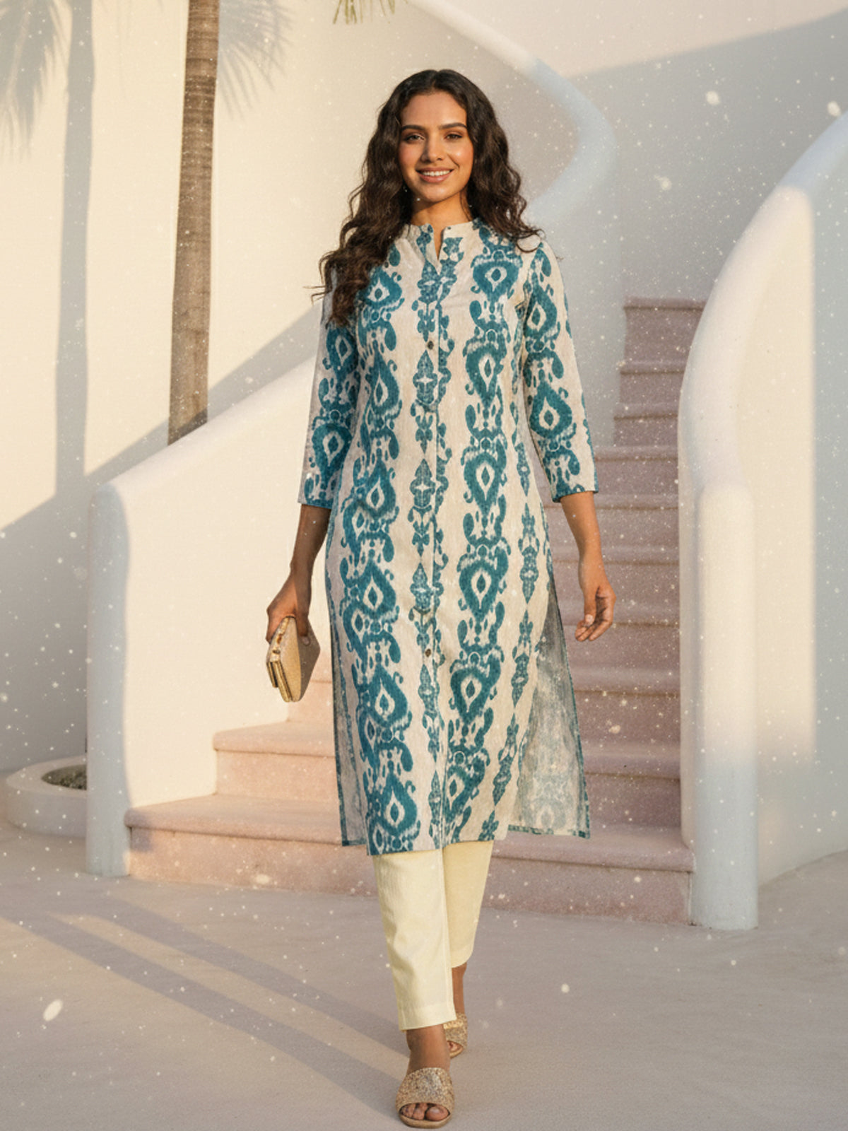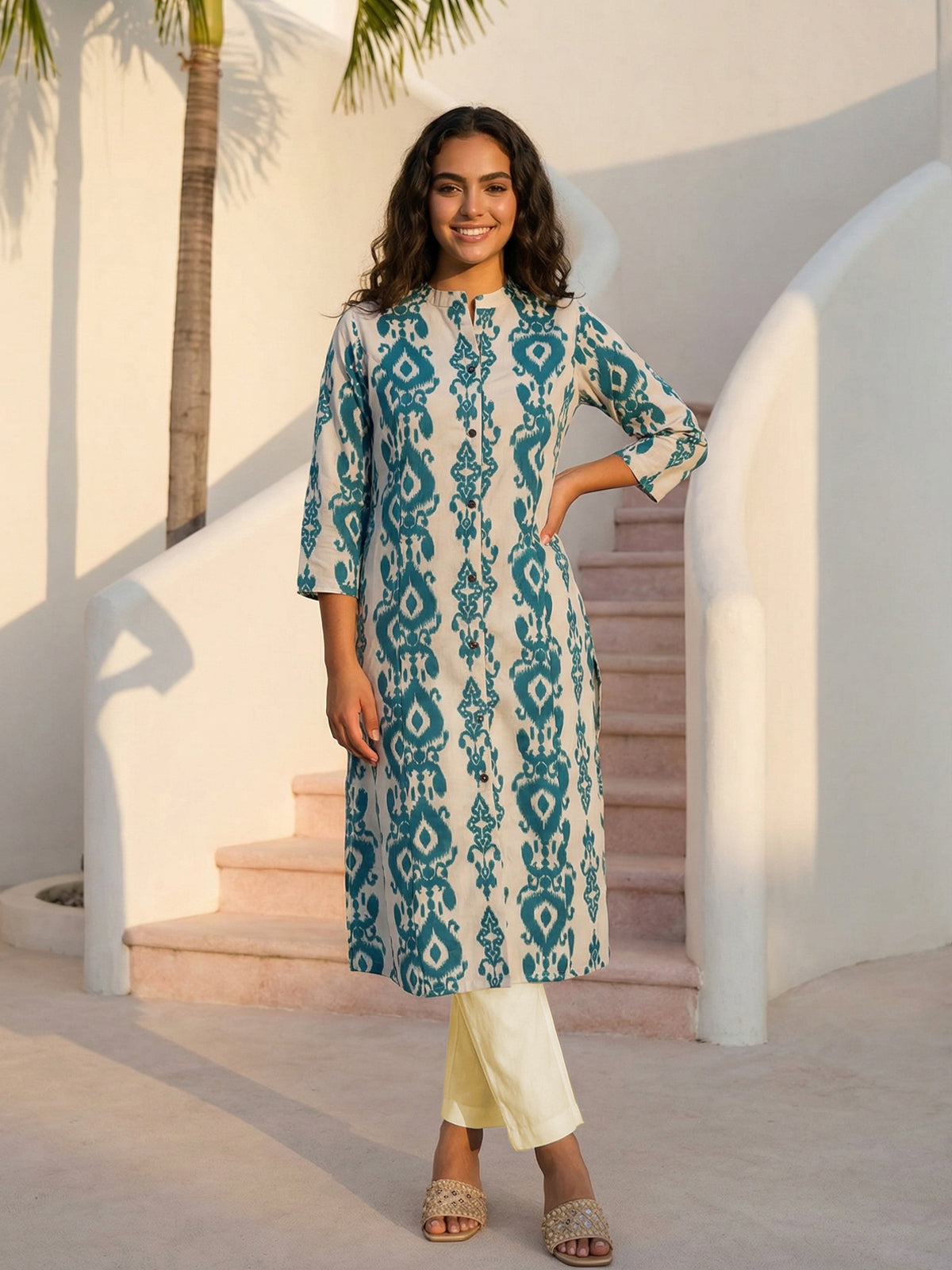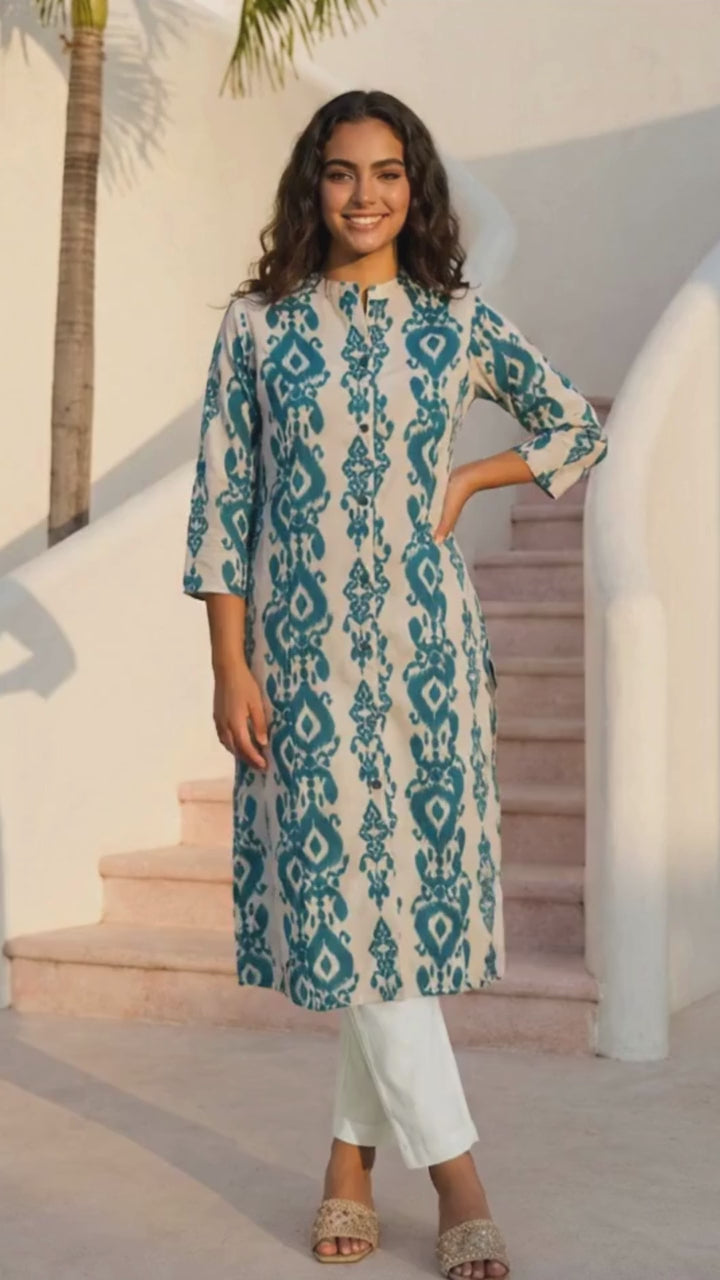 Enhance your ethnic wardrobe with this stylish Women’s Airy Linen Cotton Ikat Printed Kurta Set. Made from a breathable and lightweight linen-cotton blend, this set ensures superior comfort throughout the day. The beautifully crafted Ikat print adds a modern yet traditional charm, while the straight-cut kurta with 3/4th sleeves provides a flattering and elegant look. Paired with comfortable matching pants, this set is perfect for office wear, festive gatherings, or casual outings. Its soft, airy fabric makes it ideal for all-season wear. Step out with confidence and style in this contemporary and comfortable linen cotton kurta set.