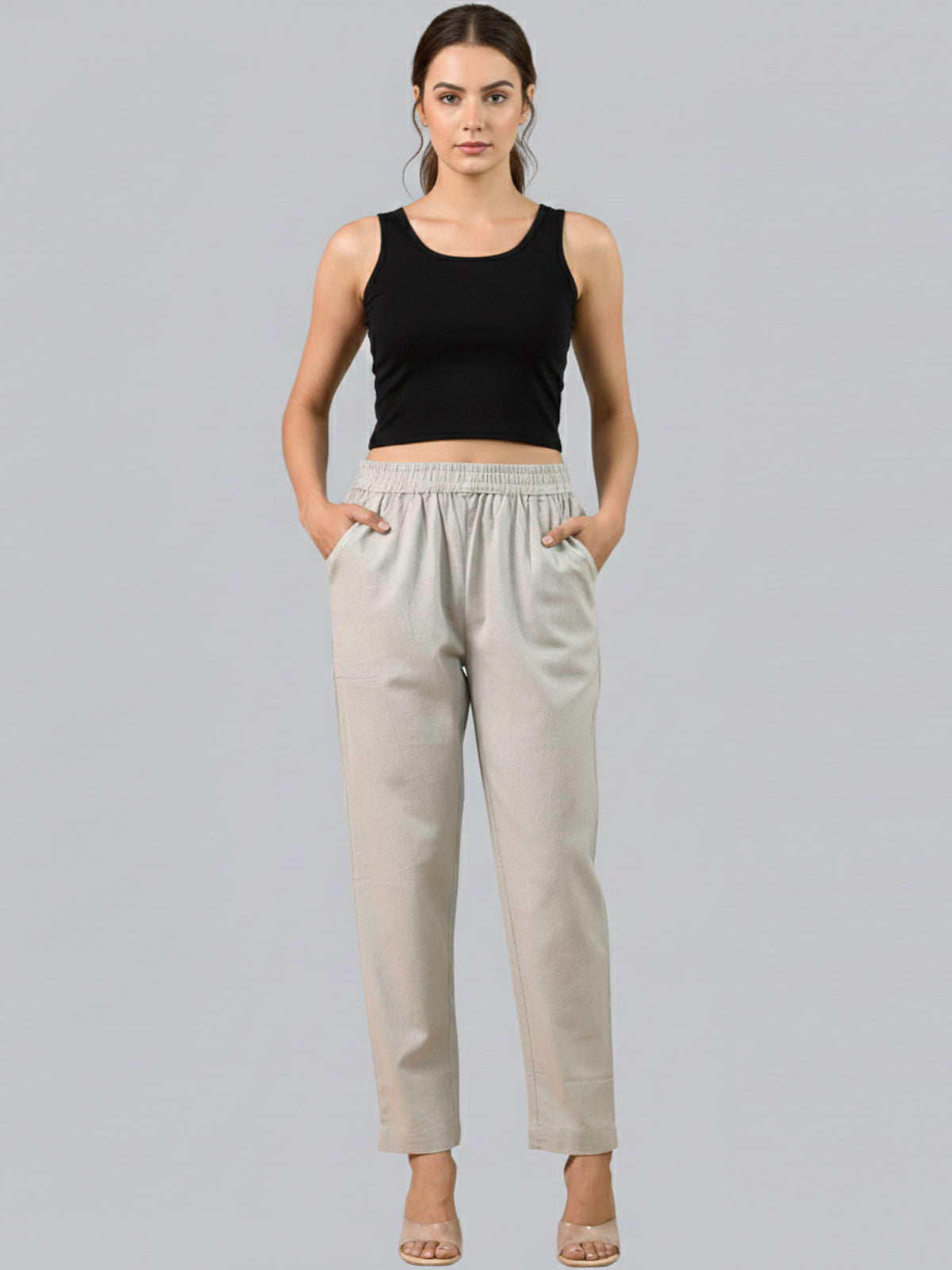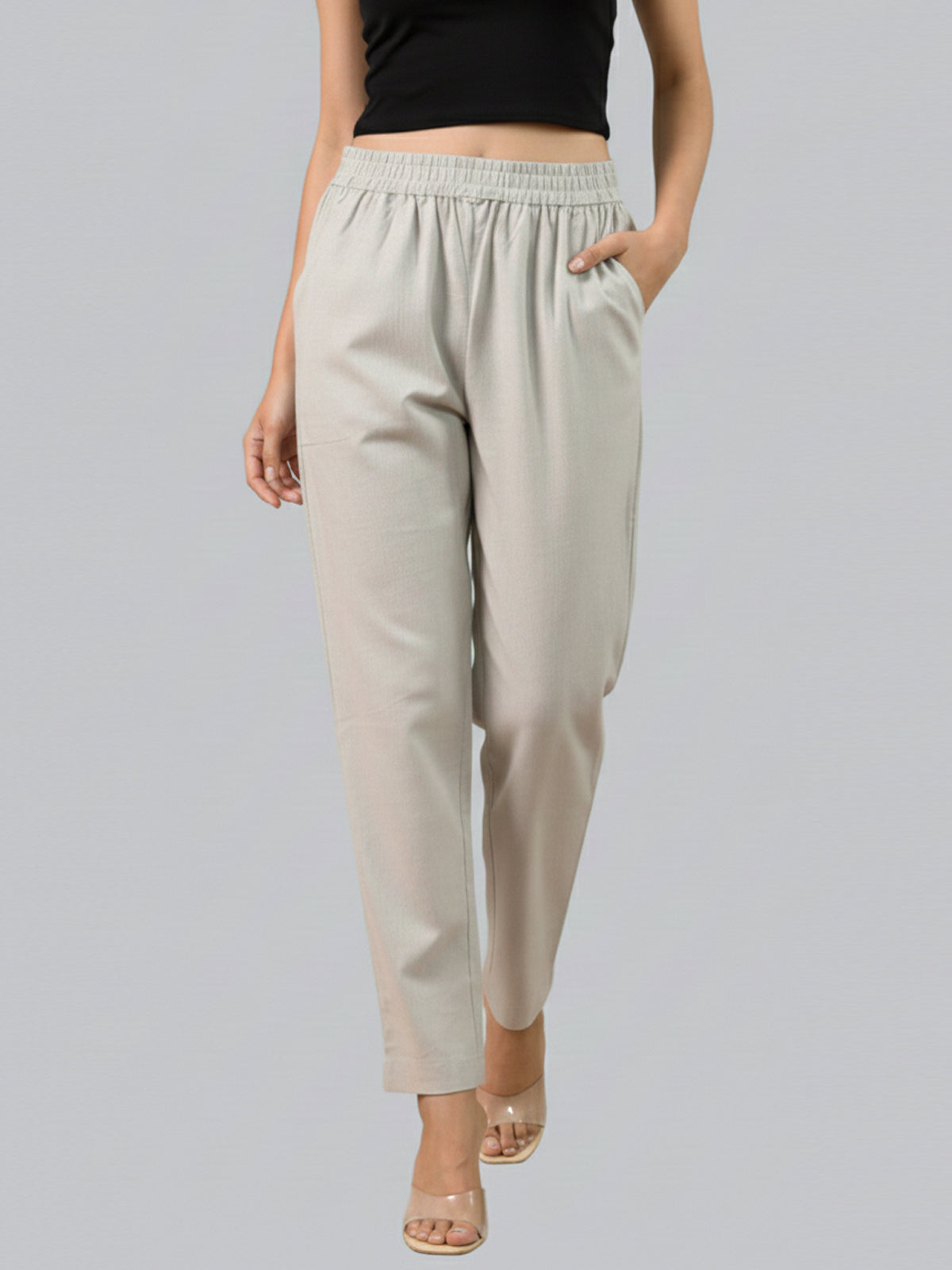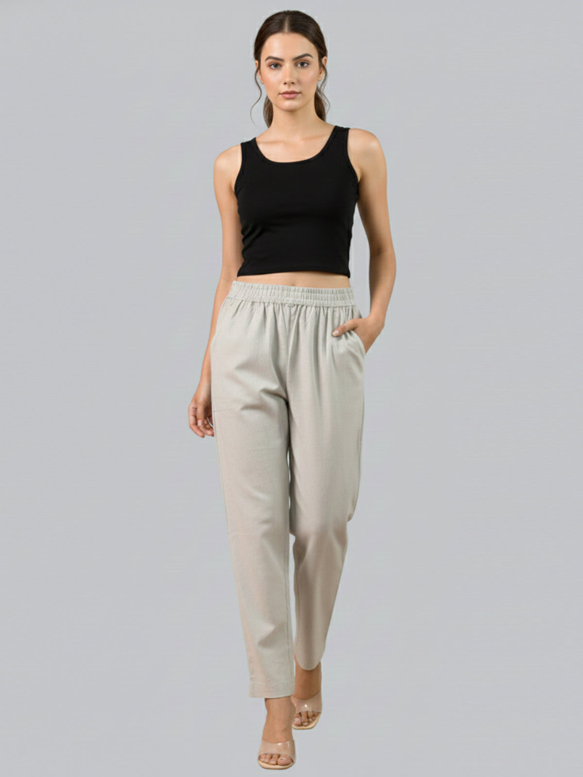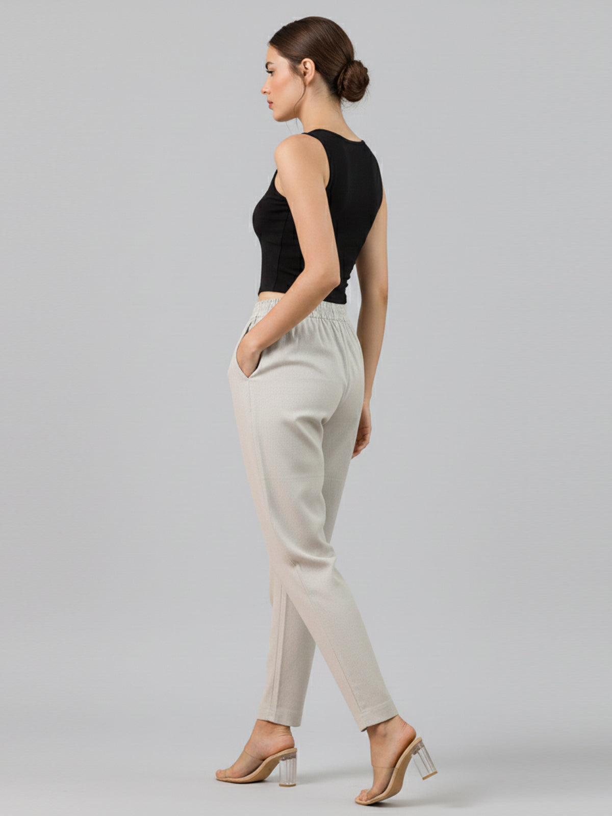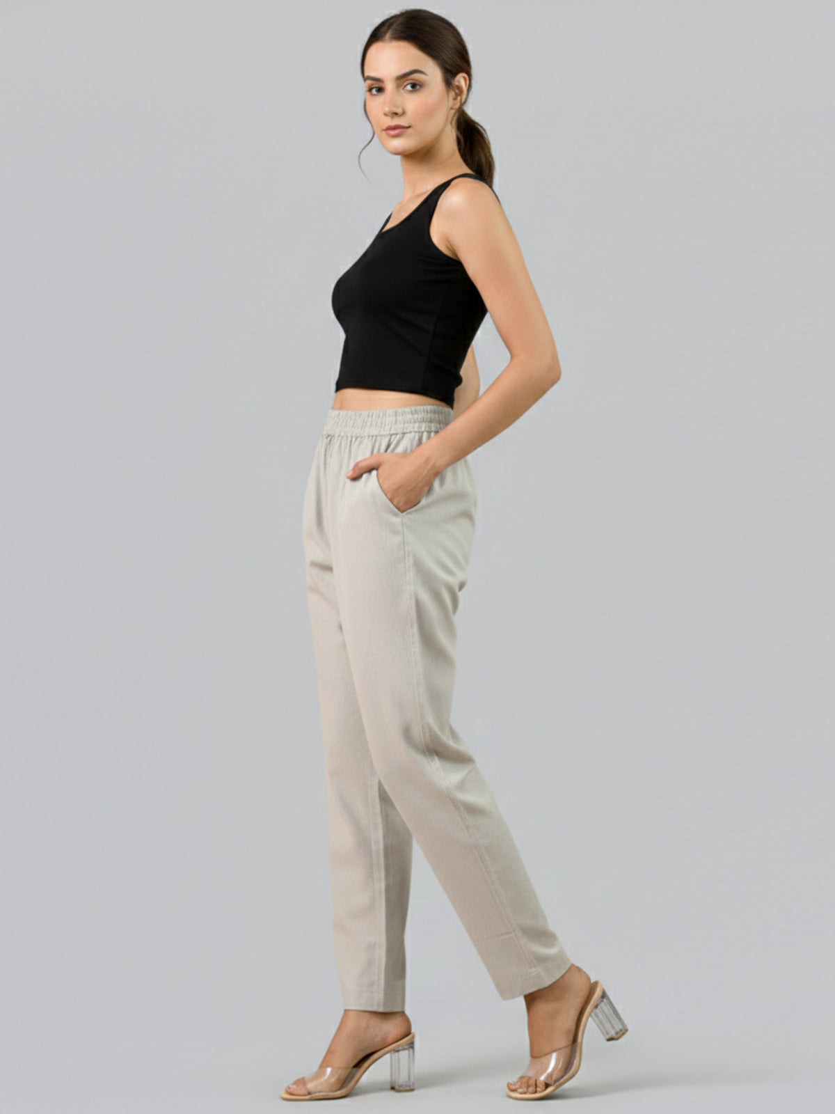 This women’s beige trouser offers a perfect blend of comfort and everyday style. Designed with a fully elasticated waistband, it provides a secure and relaxed fit ideal for long hours of wear. The straight-fit silhouette gives a clean and flattering look, making it suitable for casual outings, office wear, or travel. Crafted from soft, breathable fabric, these trousers ensure ease of movement while maintaining a neat, polished appearance. The side pockets add functionality, giving space for essentials. Pair it effortlessly with tops, shirts, or crop tees for a versatile wardrobe staple that combines simplicity, comfort, and elegance.