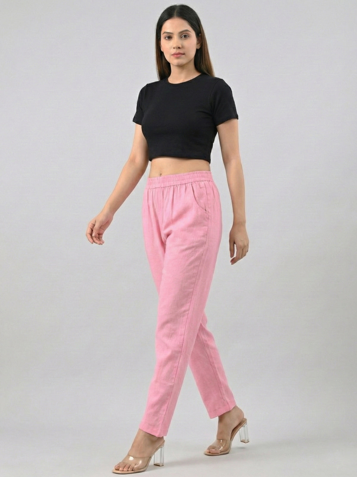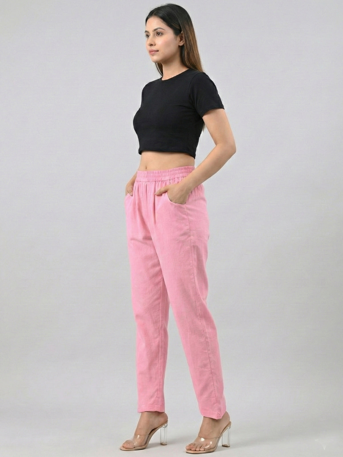 This women’s trouser offers a perfect blend of comfort and everyday style. Designed with a fully elasticated waistband, it provides a secure and relaxed fit ideal for long hours of wear. The straight-fit silhouette gives a clean and flattering look, making it suitable for casual outings, office wear, or travel. Crafted from soft, breathable fabric, these trousers ensure ease of movement while maintaining a neat, polished appearance. The side pockets add functionality, giving space for essentials. Pair it effortlessly with tops, shirts, or crop tees for a versatile wardrobe staple that combines simplicity, comfort, and elegance.