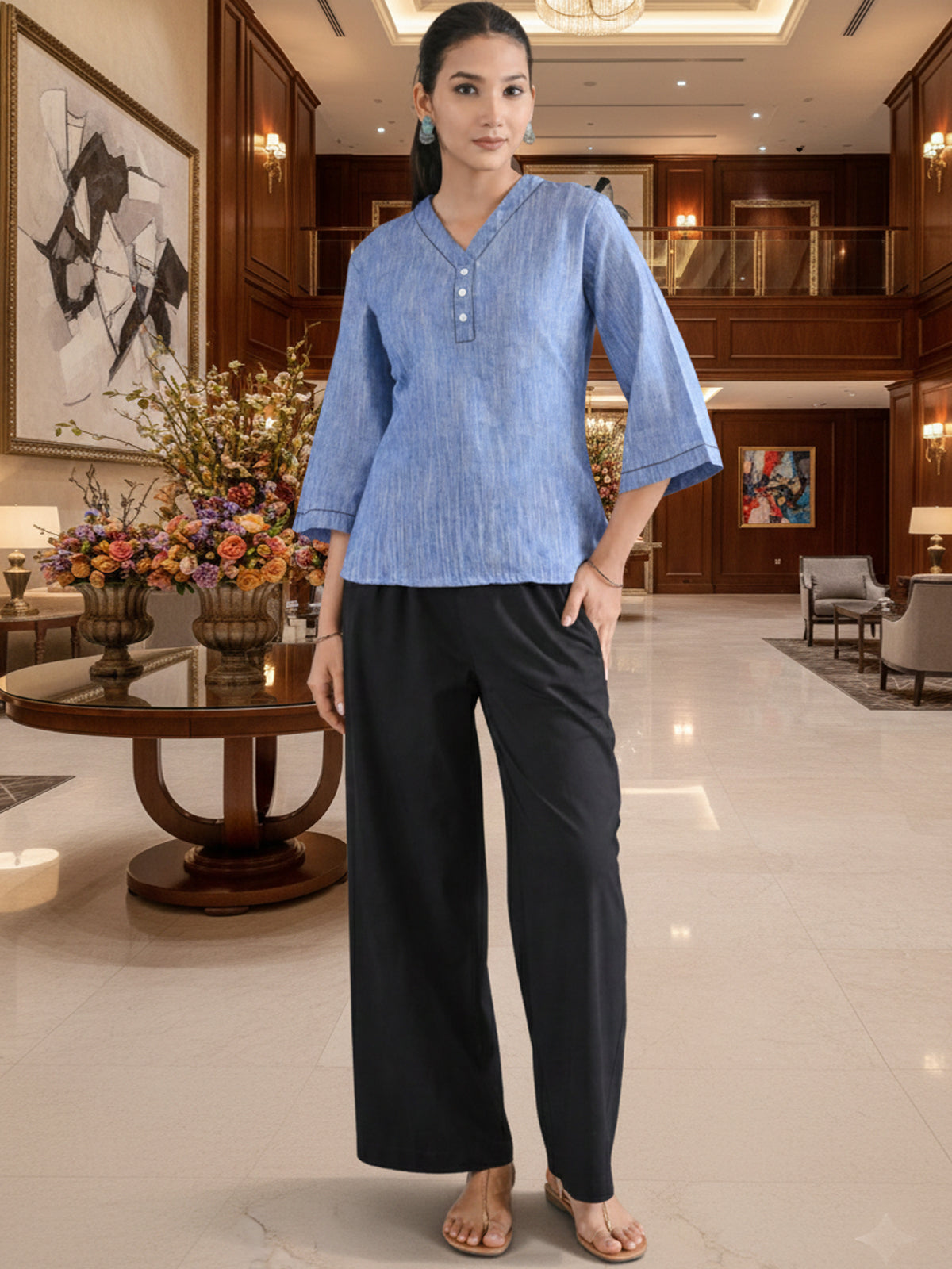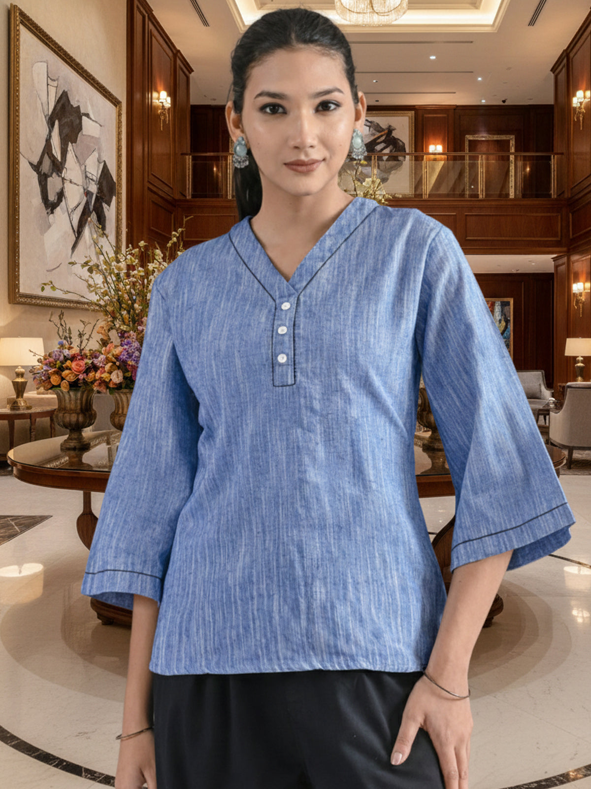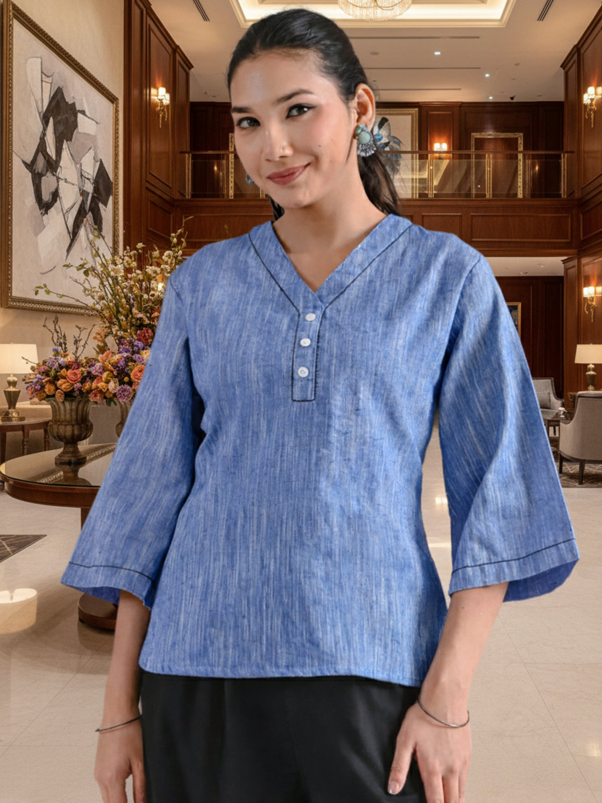 Denim Blue Handloom Cotton Anchor Thread Designer Top