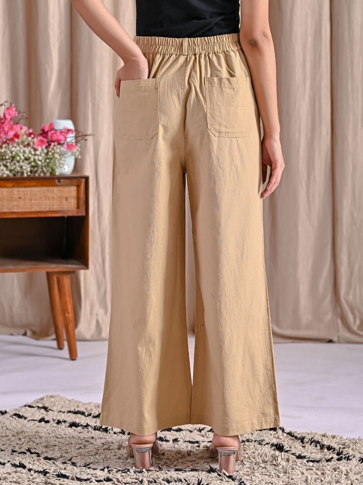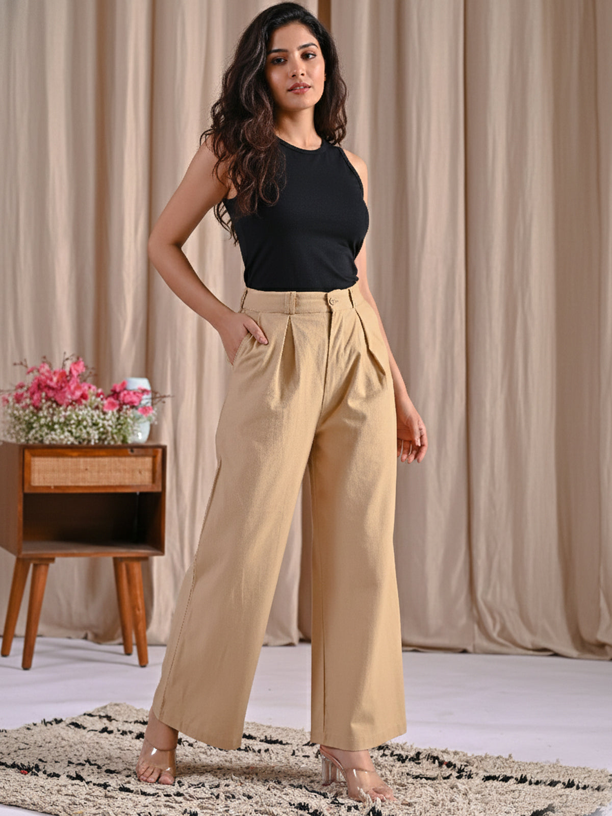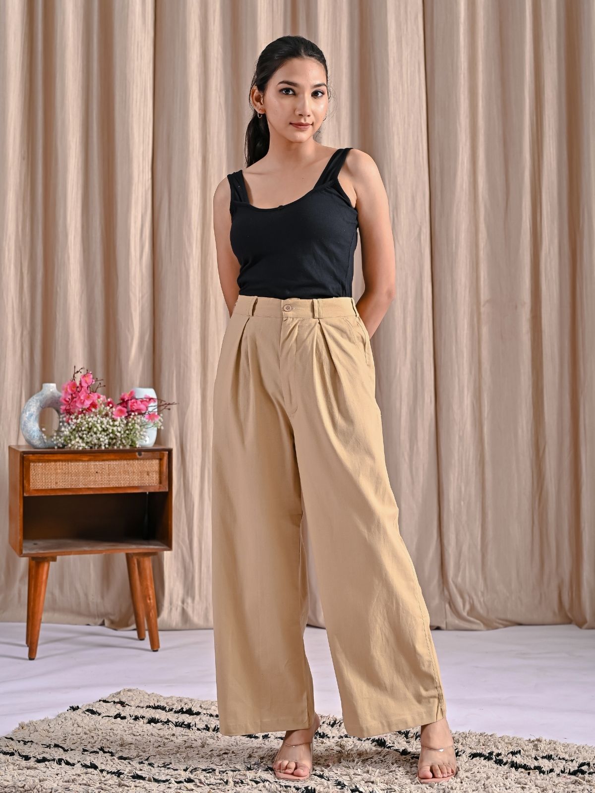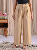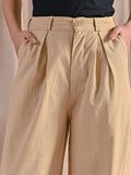Beige Relaxed Fit Wide Leg Pants - Pure Cotton