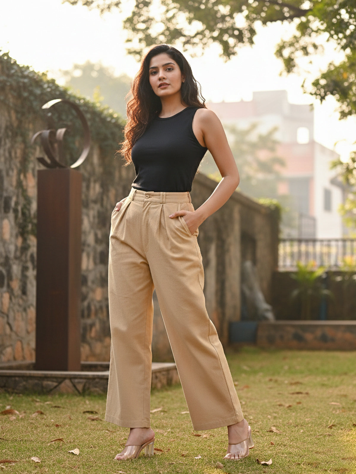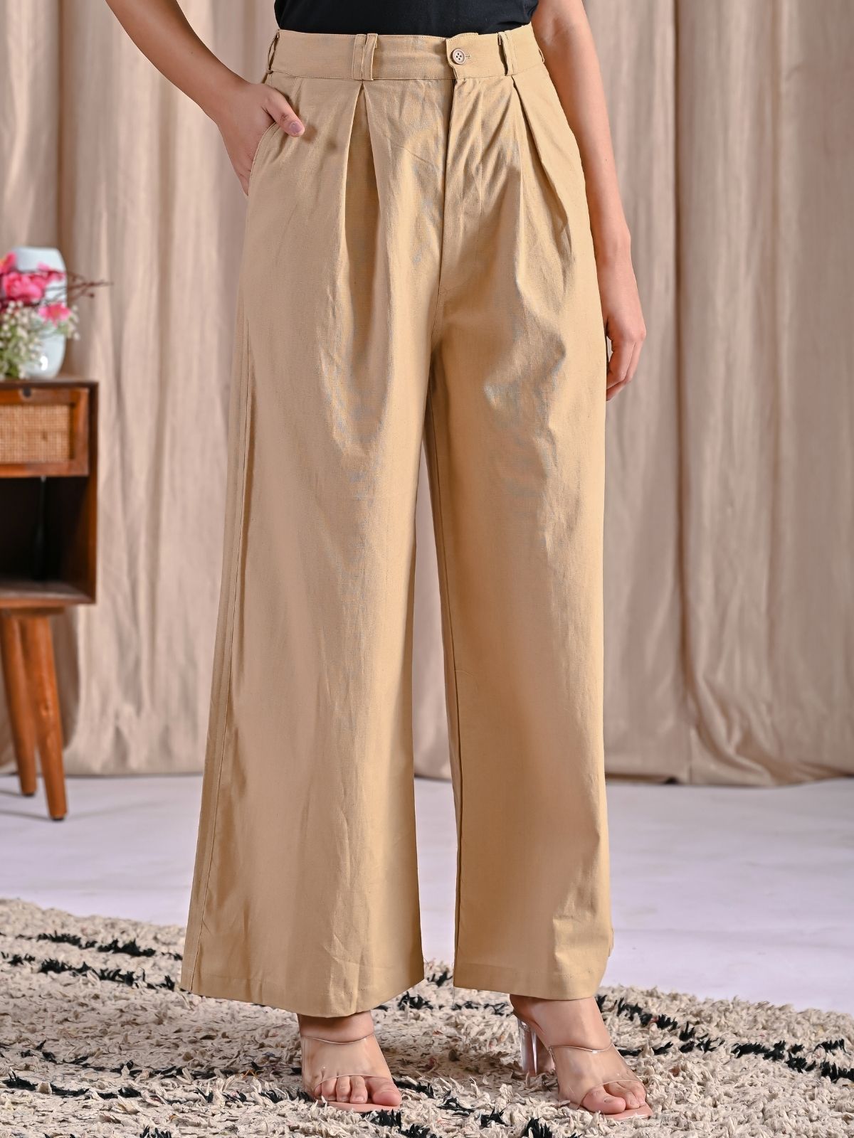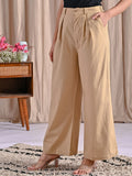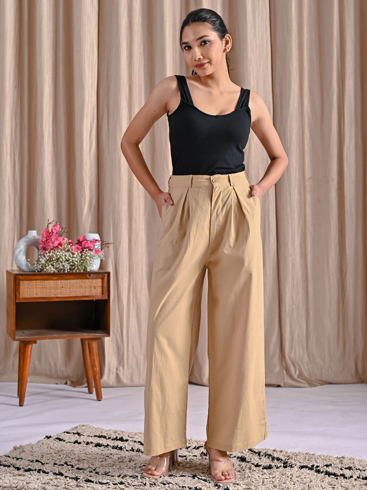 Beige Relaxed Fit Wide Leg Pants - Pure Cotton