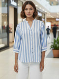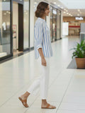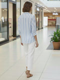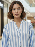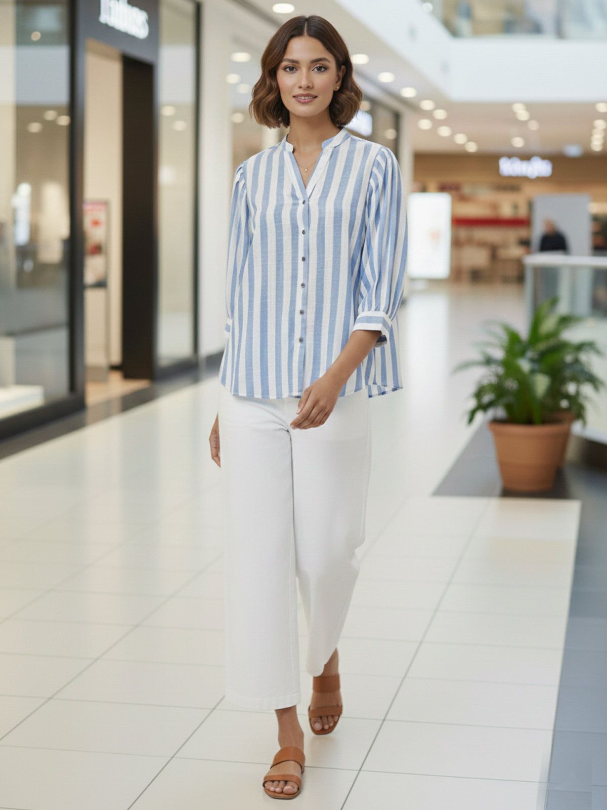 Refresh your everyday wardrobe with this stylish women’s cotton striped shirt, designed for comfort and effortless elegance. Made from breathable pure cotton fabric, it keeps you cool and comfortable throughout the day. The vertical blue and white stripe pattern creates a clean, modern look, while the delicately crafted pleats on the shoulders add subtle volume and a refined finish. Featuring a smart mandarin collar with a button-down front and three-quarter sleeves with cuff detailing, this shirt is perfect for office wear, casual outings, or weekend styling. Pair it with jeans or trousers for a versatile and polished appearance.