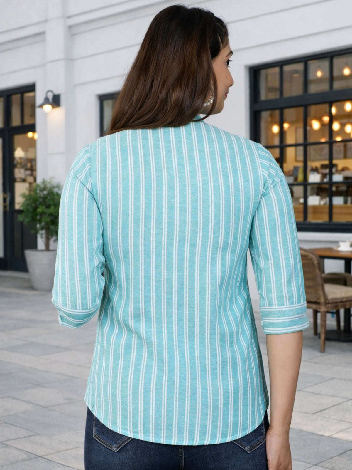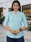 Refresh your everyday wardrobe with this stylish Stripe Mango Line Shirt, designed for comfort and effortless elegance. Made from breathable pure cotton fabric, it keeps you cool and comfortable throughout the day. The vertical red and white stripe pattern creates a clean, modern look, while the delicately crafted pleats on the shoulders add subtle volume and a refined finish. Featuring a smart mandarin collar with a button-down front and three-quarter sleeves with cuff detailing, this shirt is perfect for office wear, casual outings, or weekend styling. Pair it with jeans or trousers for a versatile and polished appearance.