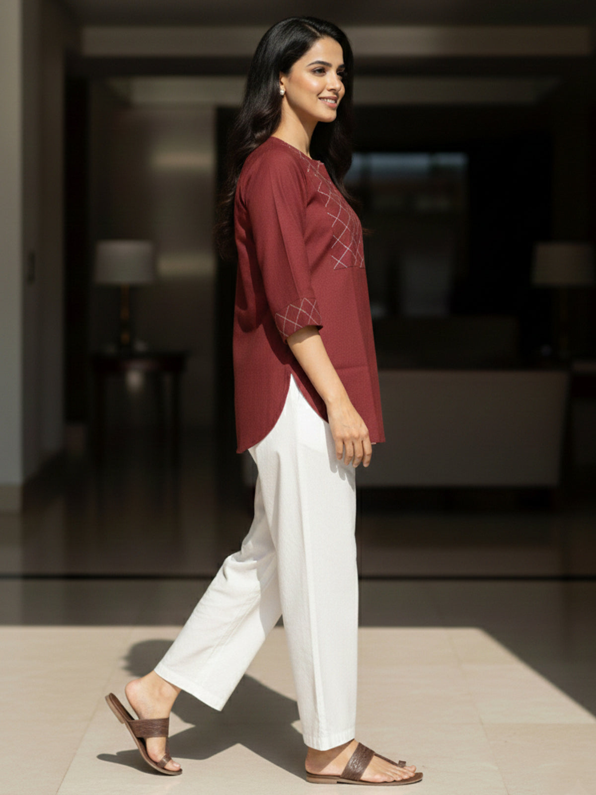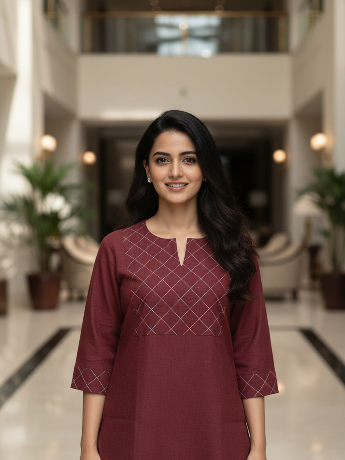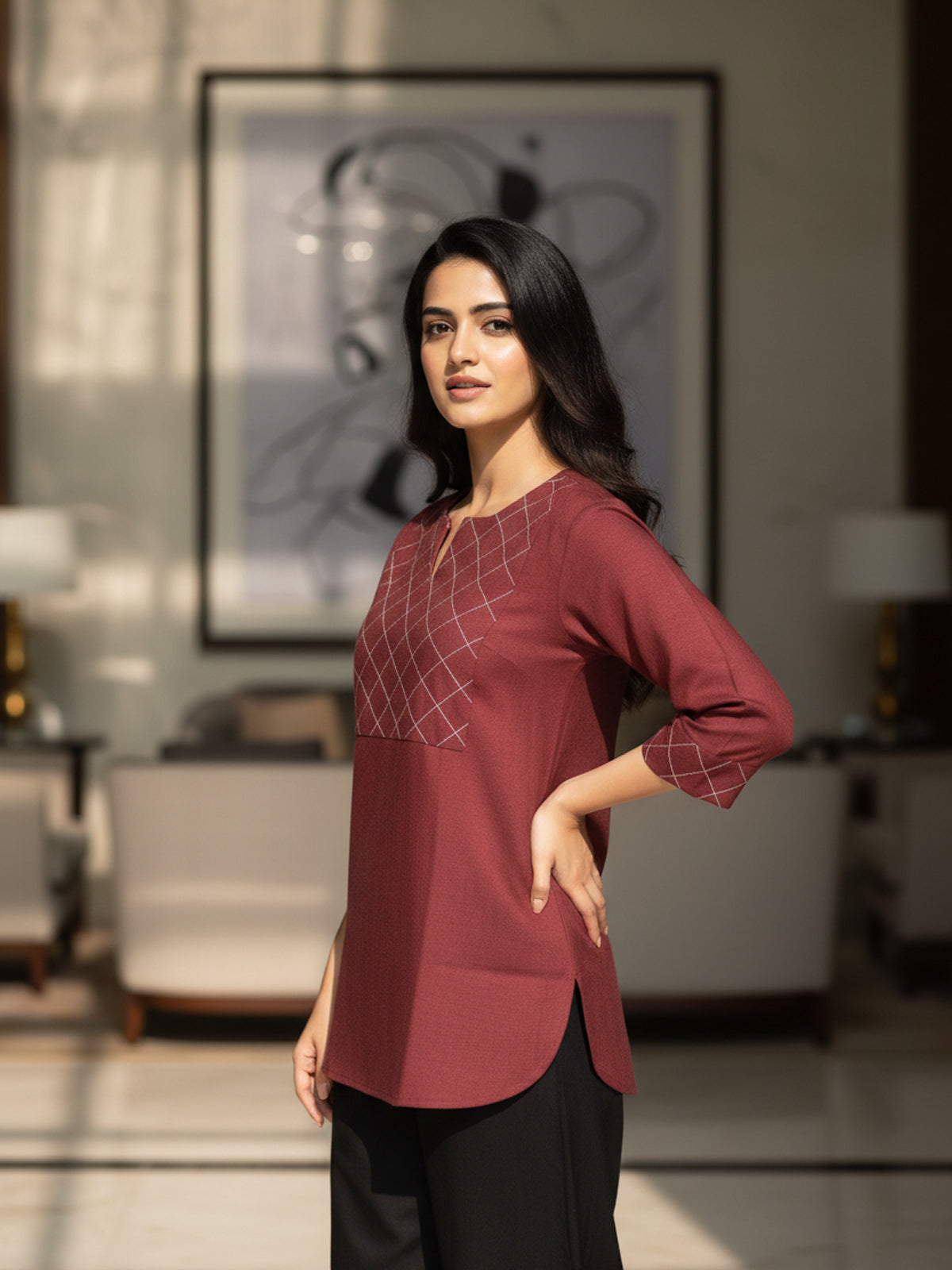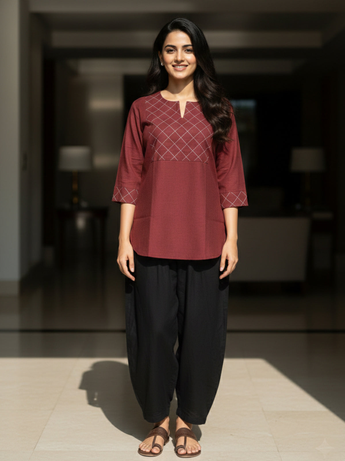 Enhance your everyday style with this womens elegant handloom cotton top, thoughtfully crafted for comfort and timeless appeal. Made from premium handloom cotton fabric, it offers excellent breathability and a soft, natural feel against the skin. The finely stitched yoke design adds subtle texture and sophistication, while the straight-fit silhouette ensures all-day ease. Featuring 3/4th sleeves and a clean notched neckline with a convenient pull-on style, this top is perfect for office wear, college, or casual outings. Easy to pair with trousers, jeans, or palazzos, it delivers a graceful, minimalist look suitable for daily wear.